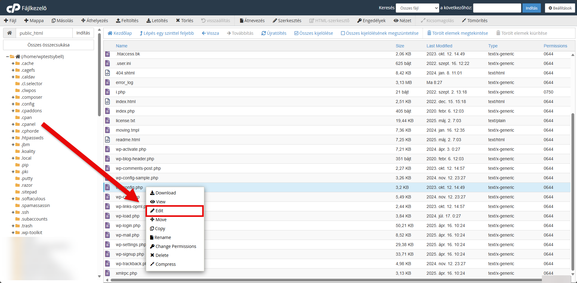 2. A weboldalunk fájljai között keressük meg és szerkesszük a wp-config.php fájlt.