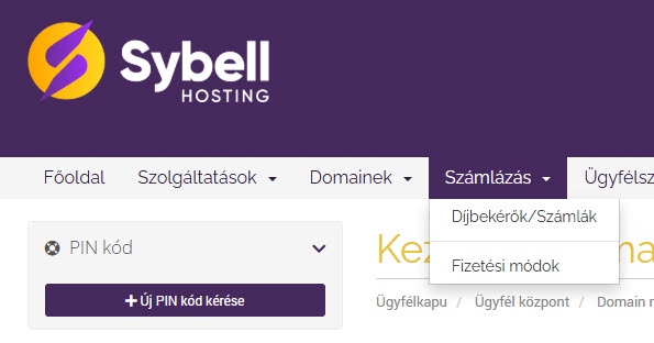 A Sybell Ügyfélkapunkra belépve és a Számlázás menüpontot lenyitva láthatjuk az ide tartozó lehetőségeinket.